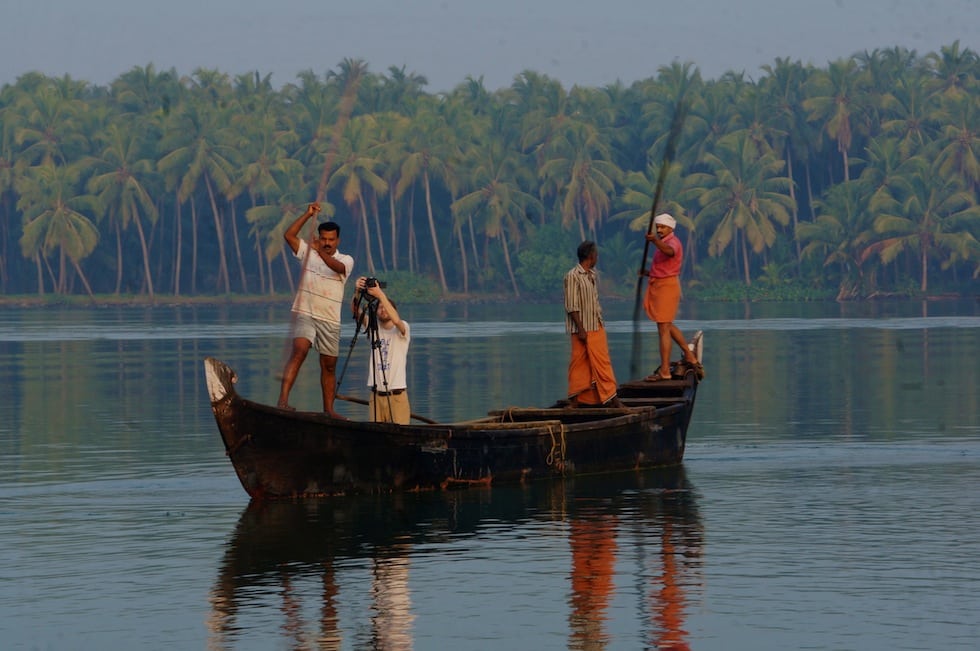 Zac Osgood, videographer, filming fishermen off The Lotus on the backwaters of Kerala.