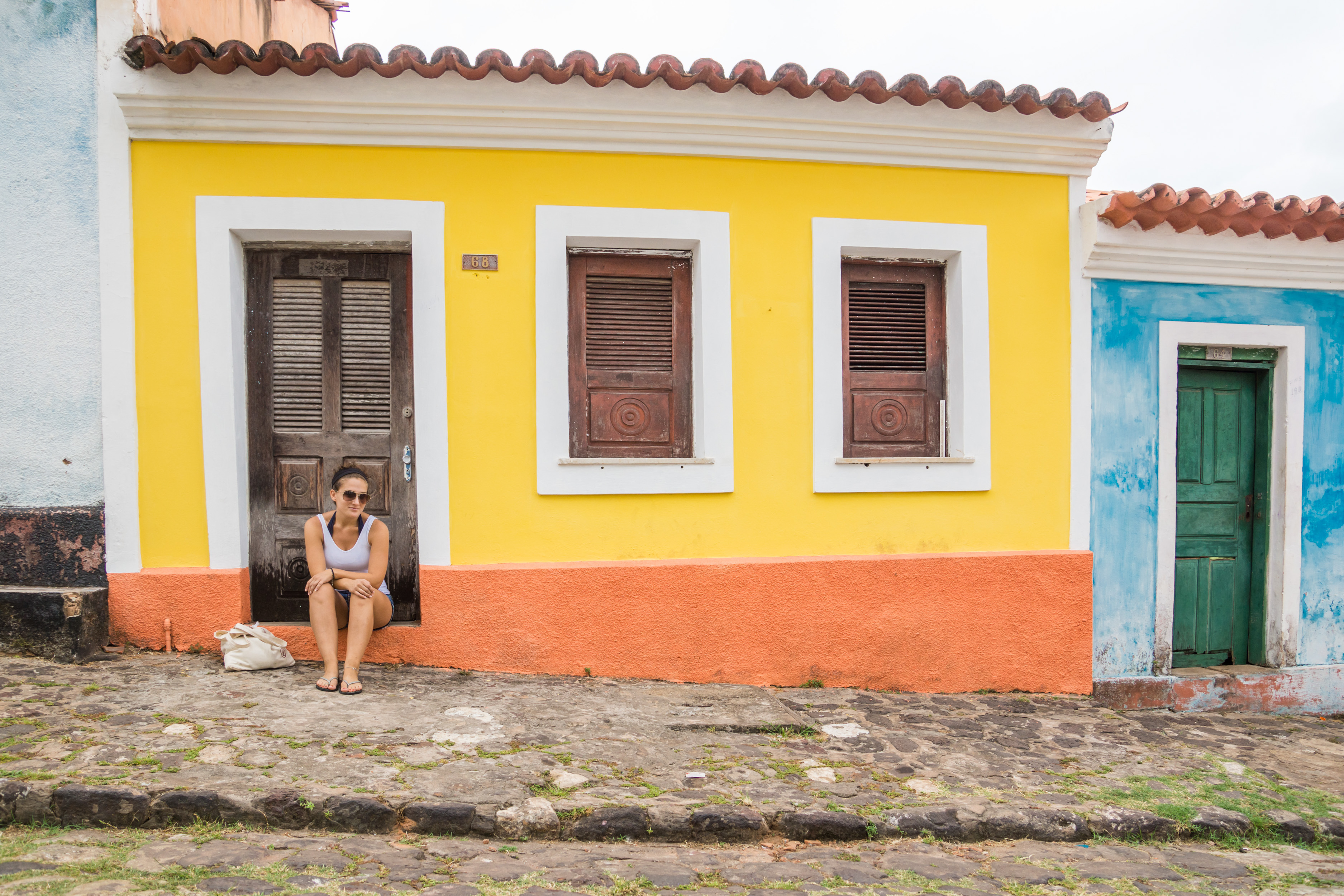 Nikki Pepper sitting on one of the many vibrant streets of Alcântara.