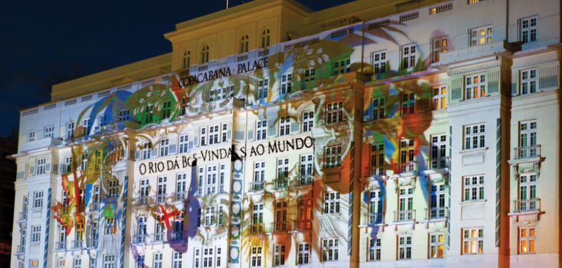 A cultural patrimony of the city of Rio de Janeiro, the Belmond Copacabana Palace has been welcoming legendary artists and royals since the day it opened its doors in 1923. Notable guests of the luxury hotel include Madonna, Walt Disney, Marilyn Monroe and Princess Diana. For the next few weeks, however, with Kristjana S. Williams’ vibrant installation illuminating the hotel’s façade, the Belmond Copacabana Palace “welcomes the world.” The Icelandic artist’s nightly projections begin with a swarm of multi-colored butterflies fluttering up the building’s exterior. Each butterfly in the display carries a different country’s flag on its wings, representing the coming together of nations from around the world in celebration of cultural diversity. When the kaleidoscope of butterflies disperses, the words “Rio Welcomes the World” appear, first in English then in Portuguese.